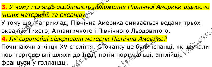 3. У чому полягає особливість положення Північної Америки відносно інших материків та океанів? У тому що, наприклад, Північна Америка омивається водами трьох океанів. Тихого, Атлантичного і Північного Льодовитого. 4. Як європейці відкривали материк Північна Америка? Починаючи з кінця XV століття. Спочатку це були іспанці, які шукали нові торговельні шляхи до Індії, потім португальці, англійці, французи у голландці.