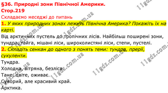 1. У яких природних зонах лежить Північна Америка? Покажіть їх на карті. Від арктичних пустель до тропічних лісів. Найбільш поширені зони, тундра, тайга, мішані ліси, широколистяні ліси, степи, пустелі. 2. Складіть сенкан до одного з понять теми: тундра, прерії, сукуленти. Тундра. Холодна, вітряна, безліса. Тане, цвіте, оживає. Суворий, але красивий край. Арктика.