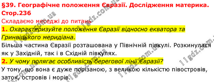 1. Охарактеризуйте положення Євразії відносно екватора та Гринвіцького меридіана. Більша частина Євразії розташована у Північній півкулі. Розкинулася як у Західній, так і в Східній півкулях. 2. У чому полягає особливість берегової лінії Євразії? У тому, що вона є дуже порізаною, з великою кількістю півостровів, заток, островів і морів.