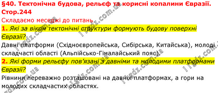 1. Які за віком тектонічні структури формують будову поверхні Євразії? Давні платформи (Східноєвропейська, Сибірська, Китайська), молоді складчасті області (Альпійсько-Гімалайський пояс). 2. Які форми рельєфу пов’язані з давніми та молодими платформами Євразії? Рівнини переважно розташовані на давніх платформах, а гори на молодих складчастих областях.