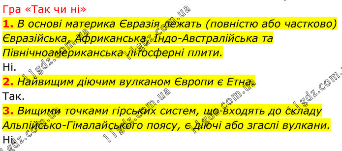 1. В основі материка Євразія лежать (повністю або частково) Євразійська, Африканська, Індо-Австралійська та Північноамериканська літосферні плити. Ні. 2. Найвищим діючим вулканом Європи є Етна. Так. 3. Вищими точками гірських систем, що входять до складу Альпійсько-Гімалайського поясу, є діючі або згаслі вулкани. Ні.