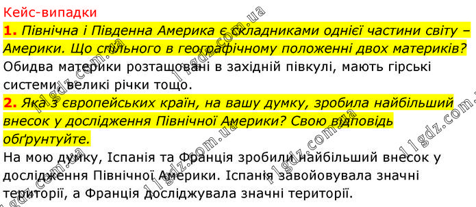 1. Північна і Південна Америка є складниками однієї частини світу – Америки. Що спільного в географічному положенні двох материків? Обидва материки розташовані в західній півкулі, мають гірські системи, великі річки тощо. 2. Яка з європейських країн, на вашу думку, зробила найбільший внесок у дослідження Північної Америки? Свою відповідь обґрунтуйте. На мою думку, Іспанія та Франція зробили найбільший внесок у дослідження Північної Америки. Іспанія завойовувала значні території, а Франція досліджувала значні території.