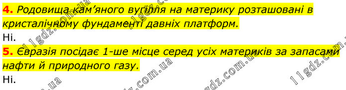 4. Родовища кам’яного вугілля на материку розташовані в кристалічному фундаменті давніх платформ. Ні. 5. Євразія посідає 1-ше місце серед усіх материків за запасами нафти й природного газу. Ні.