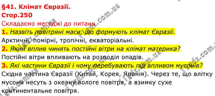 1. Назвіть повітряні маси, що формують клімат Євразії. Арктичні, помірні, тропічні, екваторіальні. 2. Який вплив чинять постійні вітри на клімат материка? Постійні вітри впливають на розподіл опадів. 3. Які частини Євразії і чому перебувають під впливом мусонів? Східна частина Євразії (Китай, Корея, Японія). Через те, що влітку мусони несуть з океану вологе повітря, а взимку сухе континентальне повітря.