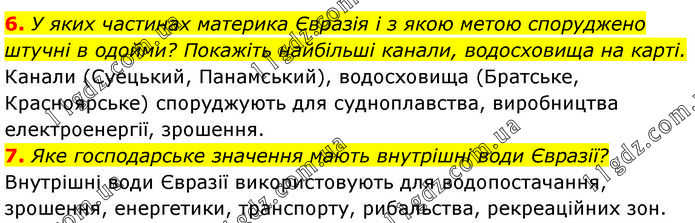 6. У яких частинах материка Євразія і з якою метою споруджено штучні в одойми? Покажіть найбільші канали, водосховища на карті. Канали (Суецький, Панамський), водосховища (Братське, Красноярське) споруджують для судноплавства, виробництва електроенергії, зрошення. 7. Яке господарське значення мають внутрішні води Євразії? Внутрішні води Євразії використовують для водопостачання, зрошення, енергетики, транспорту, рибальства, рекреаційних зон.