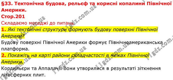 1. Які тектонічні структури формують будову поверхні Північної Америки? Будову поверхні Північної Америки формує Північноамериканська платформа. 2. Покажіть на карті райони складчастості в межах Північної Америки. Кордильєри та Аппалачі. Вони утворилися в результаті зіткнення літосферних плит.