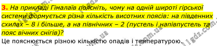 На прикладі Гімалаїв поясніть, чому на одній широті гірської системи формується різна кількість висотних поясів: на південних схилах – 8 і більше, а на північних – 2 (пустель і напівпустель та пояс вічних снігів)? Це пояснюється різною кількістю опадів і температурою.