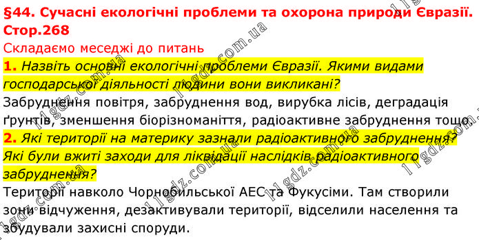 1. Назвіть основні екологічні проблеми Євразії. Якими видами господарської діяльності людини вони викликані? Забруднення повітря, забруднення вод, вирубка лісів, деградація ґрунтів, зменшення біорізноманіття, радіоактивне забруднення тощо. 2. Які території на материку зазнали радіоактивного забруднення? Які були вжиті заходи для ліквідації наслідків радіоактивного забруднення? Території навколо Чорнобильської АЕС та Фукусіми. Там створили зони відчуження, дезактивували території, відселили населення та збудували захисні споруди.