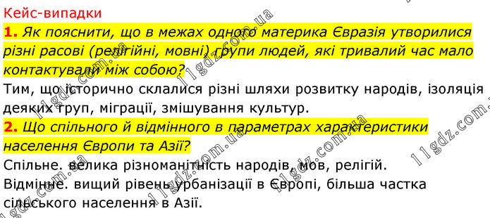 1. Як пояснити, що в межах одного материка Євразія утворилися різні расові (релігійні, мовні) групи людей, які тривалий час мало контактували між собою? Тим, що історично склалися різні шляхи розвитку народів, ізоляція деяких груп, міграції, змішування культур. 2. Що спільного й відмінного в параметрах характеристики населення Європи та Азії? Спільне. велика різноманітність народів, мов, релігій. Відмінне. вищий рівень урбанізації в Європі, більша частка сільського населення в Азії.