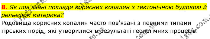 Як пов’язані поклади корисних копалин з тектонічною будовою й рельєфом материка? Родовища корисних копалин часто пов'язані з певними типами гірських порід, які утворилися в результаті геологічних процесів.