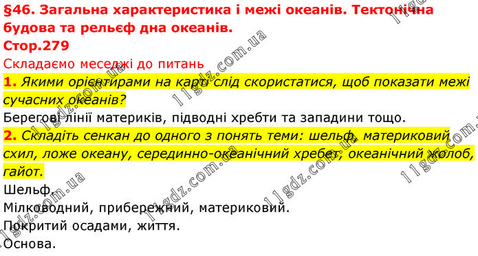 §46. Загальна характеристика і межі океанів. Тектонічна будова та рельєф дна океанів. Стор.279 Складаємо меседжі до питань 1. Якими орієнтирами на карті слід скористатися, щоб показати межі сучасних океанів? Берегові лінії материків, підводні хребти та западини тощо. 2. Складіть сенкан до одного з понять теми: шельф, материковий схил, ложе океану, серединно-океанічний хребет, океанічний жолоб, гайот. Шельф. Мілководний, прибережний, материковий. Покритий осадами, життя. Основа.