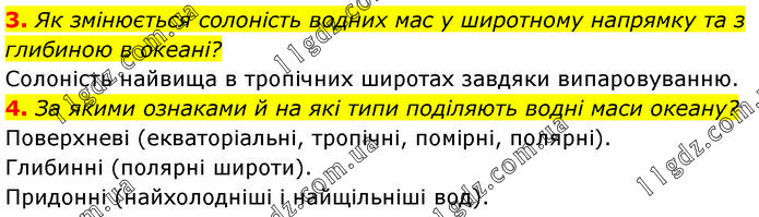 3. Як змінюється солоність водних мас у широтному напрямку та з глибиною в океані? Солоність найвища в тропічних широтах завдяки випаровуванню. 4. За якими ознаками й на які типи поділяють водні маси океану? Поверхневі (екваторіальні, тропічні, помірні, полярні). Глибинні (полярні широти). Придонні (найхолодніші і найщільніші вод).