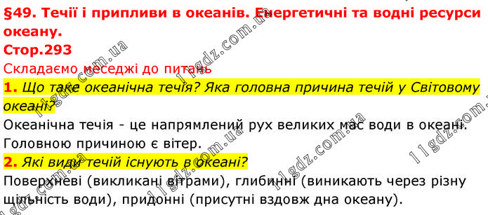 §49. Течії і припливи в океанів. Енергетичні та водні ресурси океану. Стор.293 Складаємо меседжі до питань 1. Що таке океанічна течія? Яка головна причина течій у Світовому океані? Океанічна течія - це напрямлений рух великих мас води в океані. Головною причиною є вітер. 2. Які види течій існують в океані? Поверхневі (викликані вітрами), глибинні (виникають через різну щільність води), придонні (присутні вздовж дна океану).