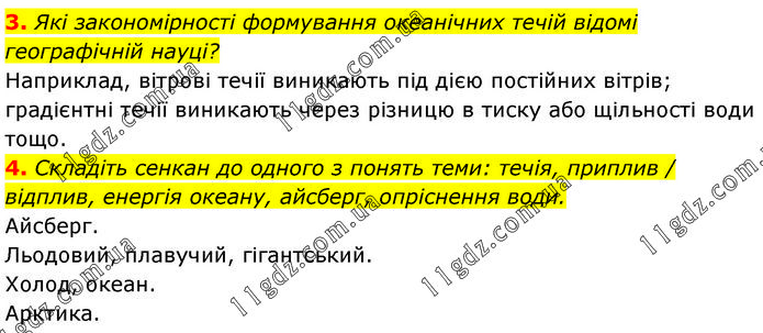 3. Які закономірності формування океанічних течій відомі географічній науці? Наприклад, вітрові течії виникають під дією постійних вітрів; градієнтні течії виникають через різницю в тиску або щільності води тощо. 4. Складіть сенкан до одного з понять теми: течія, приплив / відплив, енергія океану, айсберг, опріснення води. Айсберг. Льодовий, плавучий, гігантський. Холод, океан. Арктика.