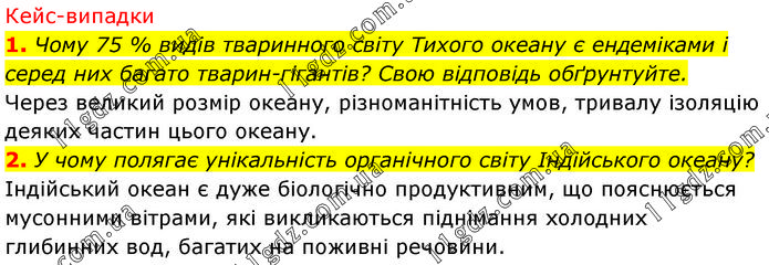 Кейс-випадки 1. Чому 75 % видів тваринного світу Тихого океану є ендеміками і серед них багато тварин-гігантів? Свою відповідь обґрунтуйте. Через великий розмір океану, різноманітність умов, тривалу ізоляцію деяких частин цього океану. 2. У чому полягає унікальність органічного світу Індійського океану? Індійський океан є дуже біологічно продуктивним, що пояснюється мусонними вітрами, які викликаються піднімання холодних глибинних вод, багатих на поживні речовини.