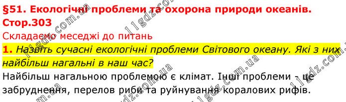 §51. Екологічні проблеми та охорона природи океанів. Стор.303 Складаємо меседжі до питань 1. Назвіть сучасні екологічні проблеми Світового океану. Які з них найбільш нагальні в наш час? Найбільш нагальною проблемою є клімат. Інші проблеми - це забруднення, перелов риби та руйнування коралових рифів.