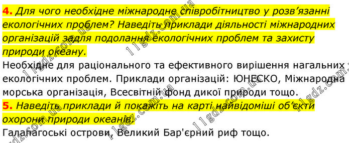 4. Для чого необхідне міжнародне співробітництво у розв’язанні екологічних проблем? Наведіть приклади діяльності міжнародних організацій задля подолання екологічних проблем та захисту природи океану. Необхідне для раціонального та ефективного вирішення нагальних екологічних проблем. Приклади організацій: ЮНЕСКО, Міжнародна морська організація, Всесвітній фонд дикої природи тощо. 5. Наведіть приклади й покажіть на карті найвідоміші об’єкти охорони природи океанів. Галапагоські острови, Великий Бар'єрний риф тощо.