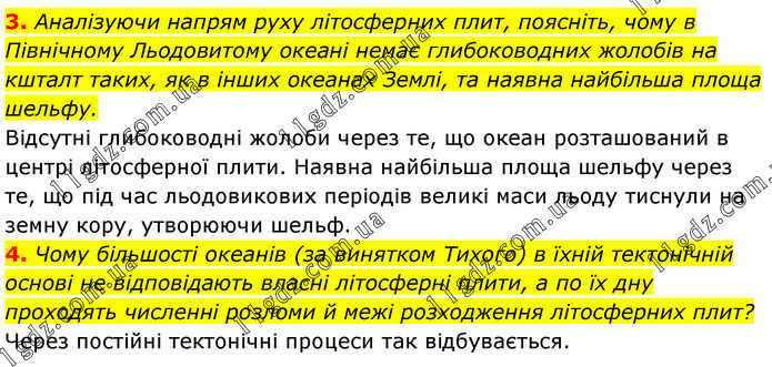 3. Аналізуючи напрям руху літосферних плит, поясніть, чому в Північному Льодовитому океані немає глибоководних жолобів на кшталт таких, як в інших океанах Землі, та наявна найбільша площа шельфу. Відсутні глибоководні жолоби через те, що океан розташований в центрі літосферної плити. Наявна найбільша площа шельфу через те, що під час льодовикових періодів великі маси льоду тиснули на земну кору, утворюючи шельф. 4. Чому більшості океанів (за винятком Тихого) в їхній тектонічній основі не відповідають власні літосферні плити, а по їх дну проходять численні розломи й межі розходження літосферних плит? Через постійні тектонічні процеси так відбувається.