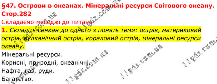 §47. Острови в океанах. Мінеральні ресурси Світового океану. Стор.282 Складаємо меседжі до питань 1. Складіть сенкан до одного з понять теми: острів, материковий острів, вулканічний острів, кораловий острів, мінеральні ресурси океану. Мінеральні ресурси. Корисні, природні, океанічні. Нафта, газ, руди. Багатство.