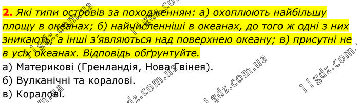 Які типи островів за походженням: а) охоплюють найбільшу площу в океанах; б) найчисленніші в океанах, до того ж одні з них зникають, а інші з’являються над поверхнею океану; в) присутні не в усіх океанах. Відповідь обґрунтуйте. а) Материкові (Гренландія, Нова Гвінея). б) Вулканічні та коралові. в) Коралові.