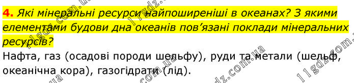 Які мінеральні ресурси найпоширеніші в океанах? З якими елементами будови дна океанів пов’язані поклади мінеральних ресурсів? Нафта, газ (осадові породи шельфу), руди та метали (шельф, океанічна кора), газогідрати (лід).