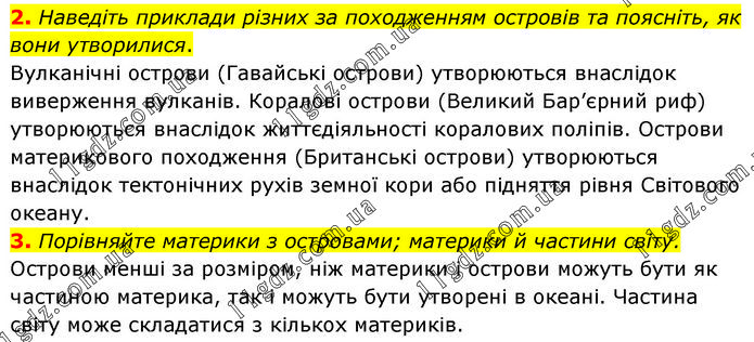 2. Наведіть приклади різних за походженням островів та поясніть, як вони утворилися. Вулканічні острови (Гавайські острови) утворюються внаслідок виверження вулканів. Коралові острови (Великий Бар’єрний риф) утворюються внаслідок життєдіяльності коралових поліпів. Острови материкового походження (Британські острови) утворюються внаслідок тектонічних рухів земної кори або підняття рівня Світового океану. 3. Порівняйте материки з островами; материки й частини світу. Острови менші за розміром, ніж материки і острови можуть бути як частиною материка, так і можуть бути утворені в океані. Частина світу може складатися з кількох материків.