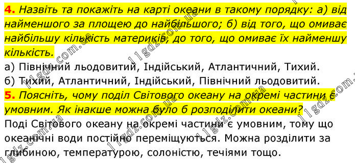 4. Назвіть та покажіть на карті океани в такому порядку: а) від найменшого за площею до найбільшого; б) від того, що омиває найбільшу кількість материків, до того, що омиває їх найменшу кількість. а) Північний льодовитий, Індійський, Атлантичний, Тихий. б) Тихий, Атлантичний, Індійський, Північний льодовитий. 5. Поясніть, чому поділ Світового океану на окремі частини є умовним. Як інакше можна було б розподілити океани? Поді Світового океану на окремі частини є умовним, тому що океанічні води постійно переміщуються. Можна розділити за глибиною, температурою, солоністю, течіями тощо.