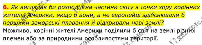 6. Як виглядав би розподіл на частини світу з точки зору корінних жителів Америки, якщо б вони, а не європейці здійснювали б першими заморські плавання й відкривали нові землі? Можливо, корінні жителі Америки поділили б світ на землі різних племен або за природними особливостями території.