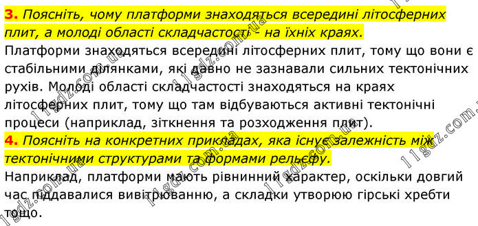 3. Поясніть, чому платформи знаходяться всередині літосферних плит, а молоді області складчастості - на їхніх краях. Платформи знаходяться всередині літосферних плит, тому що вони є стабільними ділянками, які давно не зазнавали сильних тектонічних рухів. Молоді області складчастості знаходяться на краях літосферних плит, тому що там відбуваються активні тектонічні процеси (наприклад, зіткнення та розходження плит). 4. Поясніть на конкретних прикладах, яка існує залежність між тектонічними структурами та формами рельєфу. Наприклад, платформи мають рівнинний характер, оскільки довгий час піддавалися вивітрюванню, а складки утворюю гірські хребти тощо.