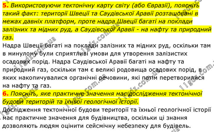 5. Використовуючи тектонічну карту світу (або Євразії), поясніть такий факт: території Швеції та Саудівської Аравії розташовані в межах давніх платформ, проте надра Швеції багаті на поклади залізних та мідних руд, а Саудівської Аравії - на нафту та природний газ. Надра Швеції багаті на поклади залізних та мідних руд, оскільки там в минулому були сприятливі умови для утворення залізистих осадових порід. Надра Саудівської Аравії багаті на нафту та природний газ, оскільки там є великі родовища осадових порід, в яких накопичувалися органічні речовини, які потім перетворилися на нафту та газ. 6. Поясніть, яке практичне значення має дослідження тектонічної будови територій та їхньої геологічної історії. Дослідження тектонічної будови території та їхньої геологічної історії має практичне значення для будівництва, оскільки ці знання дозволяють людям оцінити сейсмічну небезпеку для будівель.