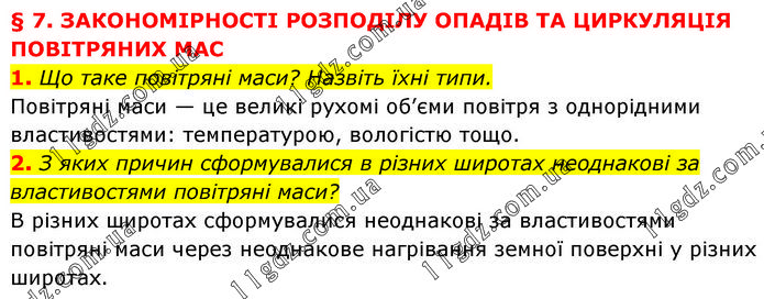 § 7. ЗАКОНОМІРНОСТІ РОЗПОДІЛУ ОПАДІВ ТА ЦИРКУЛЯЦІЯ ПОВІТРЯНИХ МАС 1. Що таке повітряні маси? Назвіть їхні типи. Повітряні маси — це великі рухомі об’єми повітря з однорідними властивостями: температурою, вологістю тощо. 2. З яких причин сформувалися в різних широтах неоднакові за властивостями повітряні маси? В різних широтах сформувалися неоднакові за властивостями повітряні маси через неоднакове нагрівання земної поверхні у різних широтах.