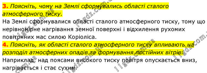 3. Поясніть, чому на Землі сформувались області сталого атмосферного тиску. На Землі сформувалися області сталого атмосферного тиску, тому що нерівномірне нагрівання земної поверхні і відхилення рухомих повітряних мас силою Коріоліса. 4. Поясніть, як області сталого атмосферного тиску впливають на розподіл атмосферних опадів та формування постійних вітрів. Наприклад, над поясами високого тиску повітря опускається вниз, нагрівається і стає сухим.