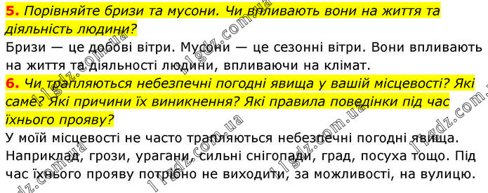 5. Порівняйте бризи та мусони. Чи впливають вони на життя та діяльність людини? Бризи — це добові вітри. Мусони — це сезонні вітри. Вони впливають на життя та діяльності людини, впливаючи на клімат. 6. Чи трапляються небезпечні погодні явища у вашій місцевості? Які саме? Які причини їх виникнення? Які правила поведінки під час їхнього прояву? У моїй місцевості не часто трапляються небезпечні погодні явища. Наприклад, грози, урагани, сильні снігопади, град, посуха тощо. Під час їхнього прояву потрібно не виходити, за можливості, на вулицю.