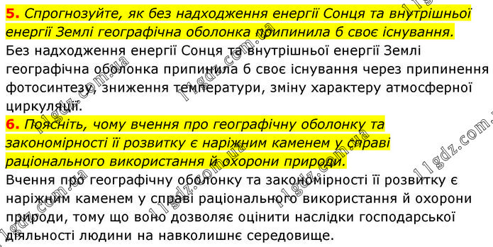 5. Спрогнозуйте, як без надходження енергії Сонця та внутрішньої енергії Землі географічна оболонка припинила б своє існування. Без надходження енергії Сонця та внутрішньої енергії Землі географічна оболонка припинила б своє існування через припинення фотосинтезу, зниження температури, зміну характеру атмосферної циркуляції. 6. Поясніть, чому вчення про географічну оболонку та закономірності її розвитку є наріжним каменем у справі раціонального використання й охорони природи. Вчення про географічну оболонку та закономірності її розвитку є наріжним каменем у справі раціонального використання й охорони природи, тому що воно дозволяє оцінити наслідки господарської діяльності людини на навколишнє середовище.