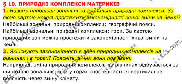 § 10. ПРИРОДНІ КОМПЛЕКСИ МАТЕРИКІВ 1. Назвіть найбільші зональні та азональні природні комплекси. За якою картою можна простежити закономірності їхньої зміни на Землі? Найбільші зональні природні комплекси: географічні пояси. Найбільші азональні природні комплекси: гори. За картою природних зон можна простежити закономірності їхньої зміни на Землі. 2. Які існують закономірності в зміні природних комплексів на рівнинах і в горах? Поясніть, з чим вони пов’язані. Наприклад, зміна природних комплексів на рівнинах відбувається за широтною зональністю, а у горах спостерігається вертикальна поясність через зміну клімату.