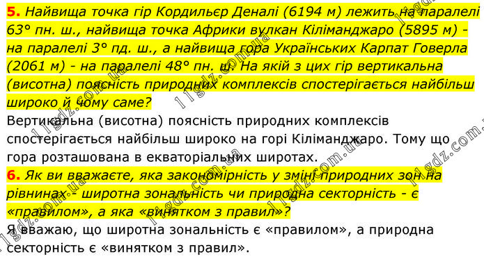 5. Найвища точка гір Кордильєр Деналі (6194 м) лежить на паралелі 63° пн. ш., найвища точка Африки вулкан Кіліманджаро (5895 м) - на паралелі 3° пд. ш., а найвища гора Українських Карпат Говерла (2061 м) - на паралелі 48° пн. ш. На якій з цих гір вертикальна (висотна) поясність природних комплексів спостерігається найбільш широко й чому саме? Вертикальна (висотна) поясність природних комплексів спостерігається найбільш широко на горі Кіліманджаро. Тому що гора розташована в екваторіальних широтах. 6. Як ви вважаєте, яка закономірність у зміні природних зон на рівнинах - широтна зональність чи природна секторність - є «правилом», а яка «винятком з правил»? Я вважаю, що широтна зональність є «правилом», а природна секторність є «винятком з правил».