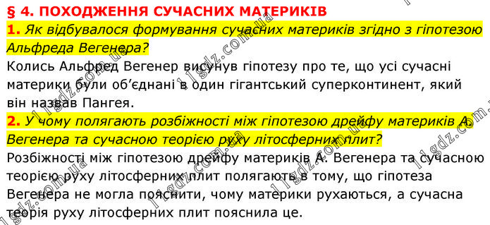 § 4. ПОХОДЖЕННЯ СУЧАСНИХ МАТЕРИКІВ 1. Як відбувалося формування сучасних материків згідно з гіпотезою Альфреда Вегенера? Колись Альфред Вегенер висунув гіпотезу про те, що усі сучасні материки були об’єднані в один гігантський суперконтинент, який він назвав Пангея. 2. У чому полягають розбіжності між гіпотезою дрейфу материків А. Вегенера та сучасною теорією руху літосферних плит? Розбіжності між гіпотезою дрейфу материків А. Вегенера та сучасною теорією руху літосферних плит полягають в тому, що гіпотеза Вегенера не могла пояснити, чому материки рухаються, а сучасна теорія руху літосферних плит пояснила це.