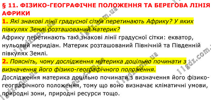 § 11. ФІЗИКО-ГЕОГРАФІЧНЕ ПОЛОЖЕННЯ ТА БЕРЕГОВА ЛІНІЯ АФРИКИ 1. Які знакові лінії градусної сітки перетинають Африку? У яких півкулях Землі розташований материк? Африку перетинають такі знакові лінії градусної сітки: екватор, нульовий меридіан. Материк розташований Північній та Південній півкулях Землі. 2. Поясніть, чому дослідження материка доцільно починати з визначення його фізико-географічного положення. Дослідження материка доцільно починати з визначення його фізико-географічного положення, тому що воно визначає кліматичні умови, природні зони, природні ресурси тощо.