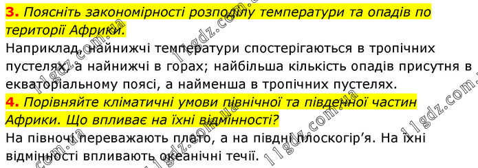 3. Поясніть закономірності розподілу температури та опадів по території Африки. Наприклад, найнижчі температури спостерігаються в тропічних пустелях, а найнижчі в горах; найбільша кількість опадів присутня в екваторіальному поясі, а найменша в тропічних пустелях. 4. Порівняйте кліматичні умови північної та південної частин Африки. Що впливає на їхні відмінності? На півночі переважають плато, а на півдні плоскогір’я. На їхні відмінності впливають океанічні течії.