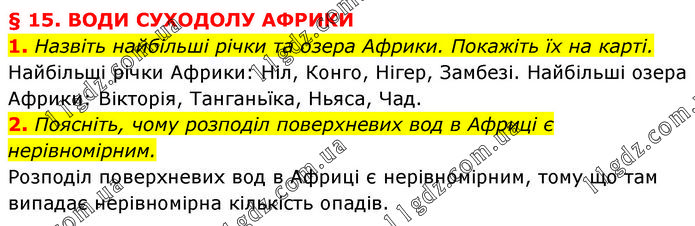 § 15. ВОДИ СУХОДОЛУ АФРИКИ 1. Назвіть найбільші річки та озера Африки. Покажіть їх на карті. Найбільші річки Африки: Ніл, Конго, Нігер, Замбезі. Найбільші озера Африки: Вікторія, Танганьїка, Ньяса, Чад. 2. Поясніть, чому розподіл поверхневих вод в Африці є нерівномірним. Розподіл поверхневих вод в Африці є нерівномірним, тому що там випадає нерівномірна кількість опадів.