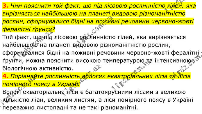 3. Чим пояснити той факт, що під лісовою рослинністю гілей, яка вирізняється найбільшою на планеті видовою різноманітністю рослин, сформувалися бідні на поживні речовини червоно-жовті фералітні ґрунти? Той факт, що під лісовою рослинністю гілей, яка вирізняється найбільшою на планеті видовою різноманітністю рослин, сформувалися бідні на поживні речовини червоно-жовті фералітні ґрунти, можна пояснити високою температурою та інтенсивною біологічною активністю. 4. Порівняйте рослинність вологих екваторіальних лісів та лісів помірного поясу в Україні. Вологі екваторіальна ліси є багатоярусними лісами з великою кількістю ліан, великим листям, а ліси помірного поясу в Україні переважно листопадні та не такі різноманітні.