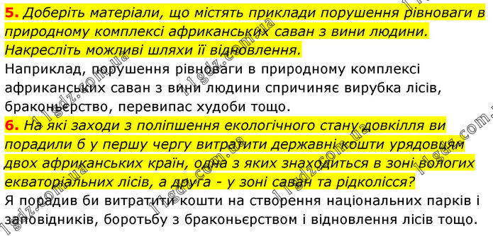 5. Доберіть матеріали, що містять приклади порушення рівноваги в природному комплексі африканських саван з вини людини. Накресліть можливі шляхи її відновлення. Наприклад, порушення рівноваги в природному комплексі африканських саван з вини людини спричиняє вирубка лісів, браконьєрство, перевипас худоби тощо. 6. На які заходи з поліпшення екологічного стану довкілля ви порадили б у першу чергу витратити державні кошти урядовцям двох африканських країн, одна з яких знаходиться в зоні вологих екваторіальних лісів, а друга - у зоні саван та рідколісся? Я порадив би витратити кошти на створення національних парків і заповідників, боротьбу з браконьєрством і відновлення лісів тощо.