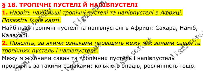 § 18. ТРОПІЧНІ ПУСТЕЛІ Й НАПІВПУСТЕЛІ 1. Назвіть найбільші тропічні пустелі та напівпустелі в Африці. Покажіть їх на карті. Найбільші тропічні пустелі та напівпустелі в Африці: Сахара, Наміб, Калахарі. 2. Поясніть, за якими ознаками проводять межу між зонами саван та тропічних пустель і напівпустель. Межу між зонами саван та тропічних пустель і напівпустель проводять за такими ознаками: кількість опадів, рослинність тощо.