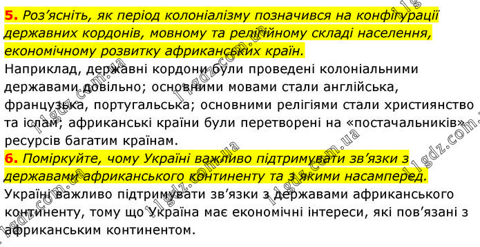 5. Роз’ясніть, як період колоніалізму позначився на конфігурації державних кордонів, мовному та релігійному складі населення, економічному розвитку африканських країн. Наприклад, державні кордони були проведені колоніальними державами довільно; основними мовами стали англійська, французька, португальська; основними релігіями стали християнство та іслам; африканські країни були перетворені на «постачальників» ресурсів багатим країнам. 6. Поміркуйте, чому Україні важливо підтримувати зв’язки з державами африканського континенту та з якими насамперед. Україні важливо підтримувати зв’язки з державами африканського континенту, тому що Україна має економічні інтереси, які пов’язані з африканським континентом.