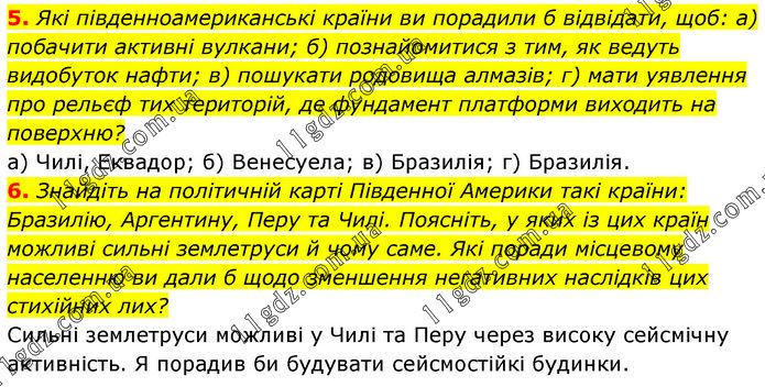 5. Які південноамериканські країни ви порадили б відвідати, щоб: а) побачити активні вулкани; б) познайомитися з тим, як ведуть видобуток нафти; в) пошукати родовища алмазів; г) мати уявлення про рельєф тих територій, де фундамент платформи виходить на поверхню? а) Чилі, Еквадор; б) Венесуела; в) Бразилія; г) Бразилія. 6. Знайдіть на політичній карті Південної Америки такі країни: Бразилію, Аргентину, Перу та Чилі. Поясніть, у яких із цих країн можливі сильні землетруси й чому саме. Які поради місцевому населенню ви дали б щодо зменшення негативних наслідків цих стихійних лих? Сильні землетруси можливі у Чилі та Перу через високу сейсмічну активність. Я порадив би будувати сейсмостійкі будинки.