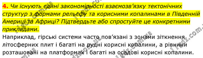 Чи існують єдині закономірності взаємозв’язку тектонічних структур з формами рельєфу та корисними копалинами в Південній Америці та Африці? Підтвердьте або спростуйте це конкретними прикладами. Наприклад, гірські системи часто пов’язані з зонами зіткнення літосферних плит і багаті на рудні корисні копалини, а рівнини розташовані на платформах і багаті на осадові корисні копалини.