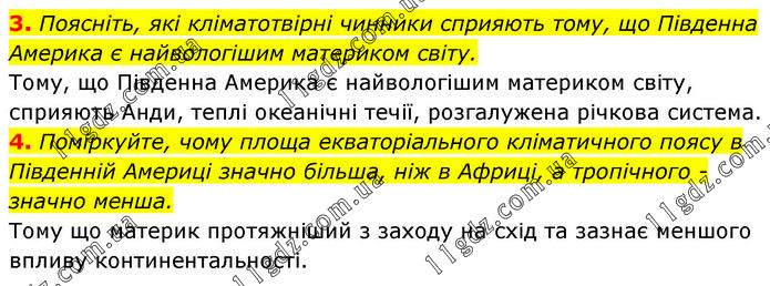 3. Поясніть, які кліматотвірні чинники сприяють тому, що Південна Америка є найвологішим материком світу. Тому, що Південна Америка є найвологішим материком світу, сприяють Анди, теплі океанічні течії, розгалужена річкова система. 4. Поміркуйте, чому площа екваторіального кліматичного поясу в Південній Америці значно більша, ніж в Африці, а тропічного - значно менша. Тому що материк протяжніший з заходу на схід та зазнає меншого впливу континентальності.