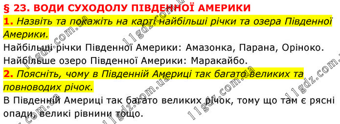 § 23. ВОДИ СУХОДОЛУ ПІВДЕННОЇ АМЕРИКИ 1. Назвіть та покажіть на карті найбільші річки та озера Південної Америки. Найбільші річки Південної Америки: Амазонка, Парана, Оріноко. Найбільше озеро Південної Америки: Маракайбо. 2. Поясніть, чому в Південній Америці так багато великих та повноводих річок. В Південній Америці так багато великих річок, тому що там є рясні опади, великі рівнини тощо.