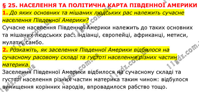 § 25. НАСЕЛЕННЯ ТА ПОЛІТИЧНА КАРТА ПІВДЕННОЇ АМЕРИКИ 1. До яких основних та мішаних людських рас належить сучасне населення Південної Америки? Сучасне населення Південної Америки належить до таких основних та мішаних людських рас: індіанці, європейці, африканці, метиси, мулати, самбо. 2. Розкажіть, як заселення Південної Америки відбилося на сучасному расовому складі та густоті населення різних частин материка. Заселення Південної Америки відбилося на сучасному складі та густоті населення різних частин материка таким чином: відбулося винищення корінних народів, впровадилося рабство тощо.