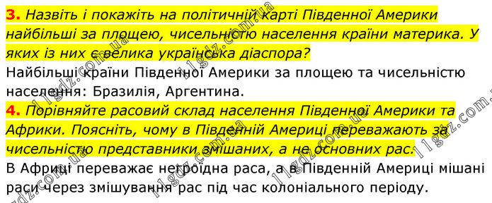 3. Назвіть і покажіть на політичній карті Південної Америки найбільші за площею, чисельністю населення країни материка. У яких із них є велика українська діаспора? Найбільші країни Південної Америки за площею та чисельністю населення: Бразилія, Аргентина. 4. Порівняйте расовий склад населення Південної Америки та Африки. Поясніть, чому в Південній Америці переважають за чисельністю представники змішаних, а не основних рас. В Африці переважає негроїдна раса, а в Південній Америці мішані раси через змішування рас під час колоніального періоду.